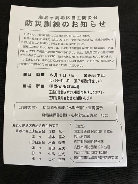 実は、昨年の10月に予定していた「海老ケ島地区 防災訓練」が総選挙の投票日にあたってしまい、延期を余儀なくされ・・本年6月1日に開催する運びとなっていますが、雨天中止としてあり、当日の天気が微妙になっています。